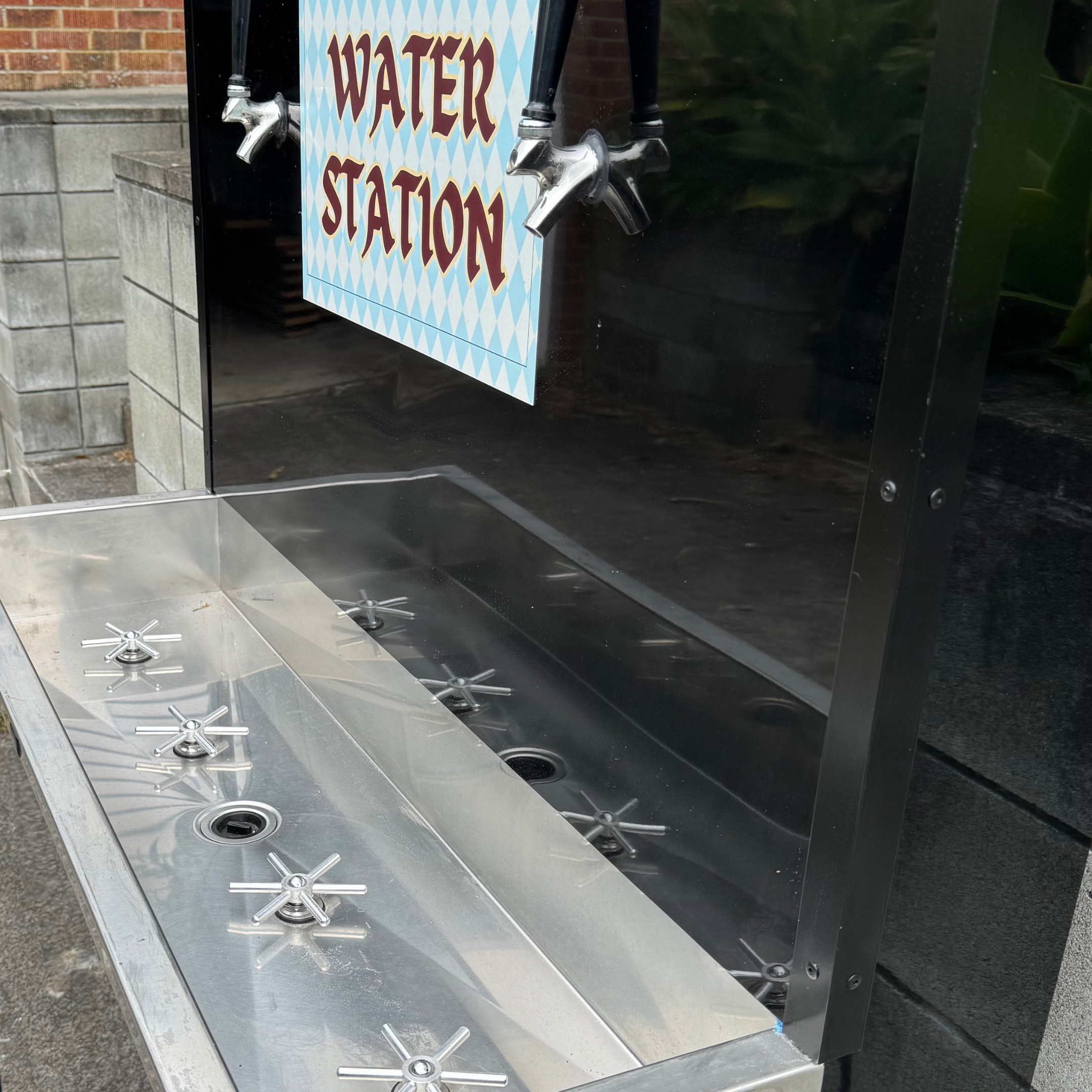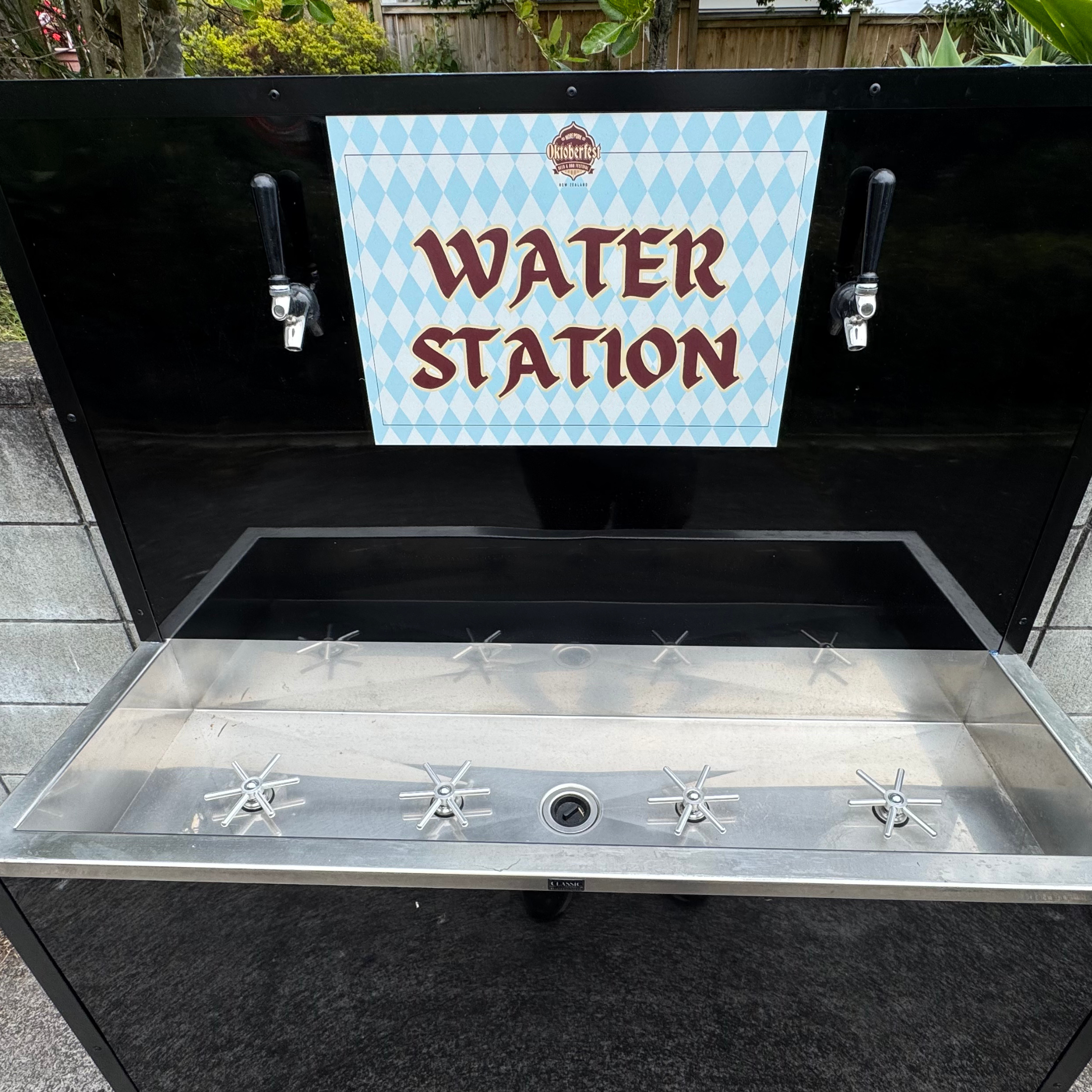 Keep your bar or event running smoothly with this custom-built rinsing and water station. designed and made by HandyCam for Morepork BBO's Oktoberfest.